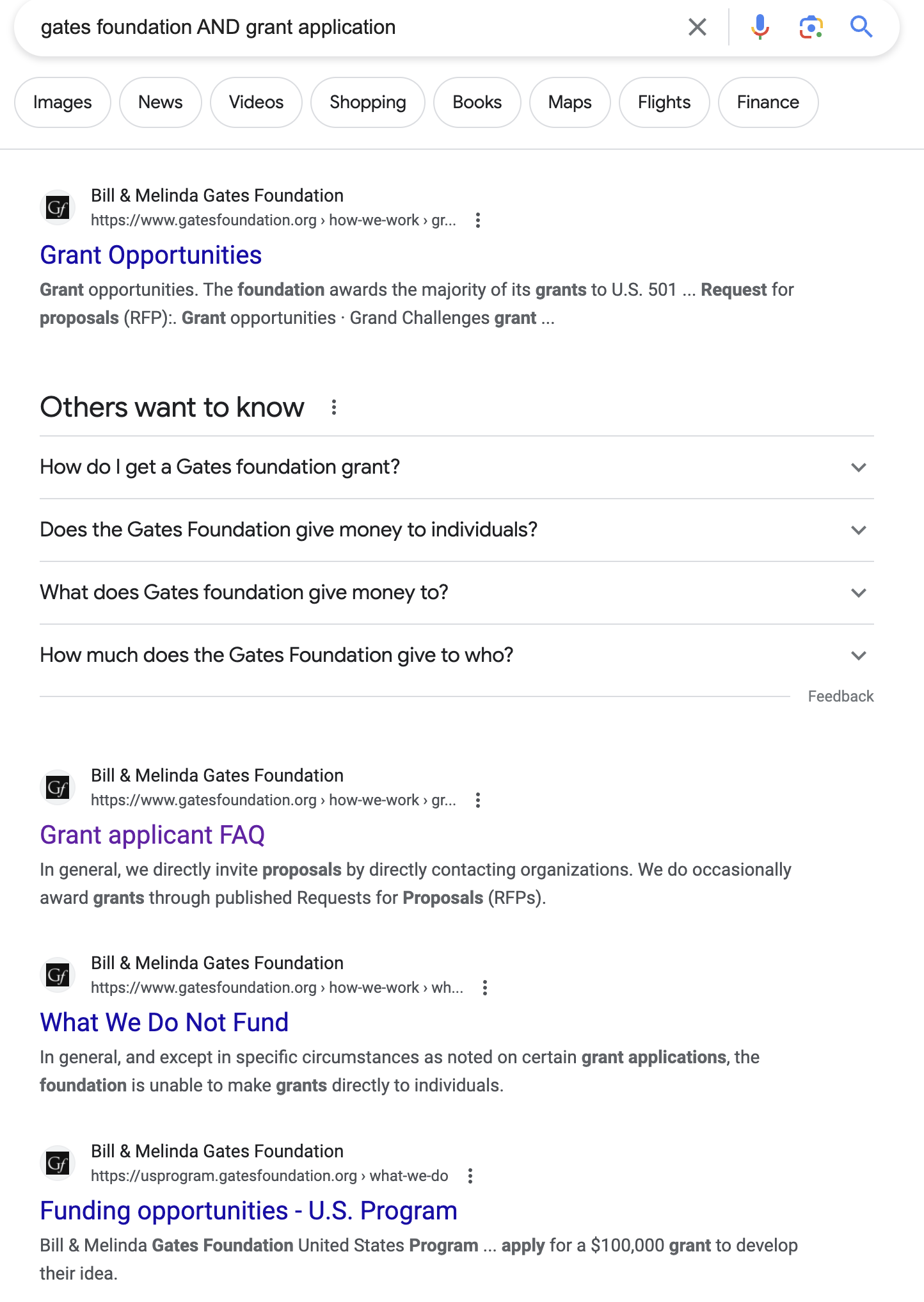 4. Conduct a Boolean search using AND, OR, or NOT to refine results. Using the connectors AND, OR, or NOT (important: AND, OR, and NOT must be capitalized to signal to Google that they are filter words) can help narrow or expand the breadth of results. You could type Gates Foundation AND grant application to generate results related to applying for grants (note that if you use the words apply or application without “grant,” some of the results may relate to applying for jobs). If you want to conduct a more flexible search, you can use OR, such as grants OR funding opportunities. To learn more tips about conducting a Boolean search, see this article on the topic from Scribbr: “Boolean Operators | Quick Guide, Examples & Tips.”